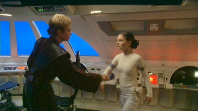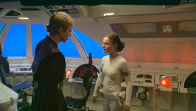 navigation area of the cockpit. PADMÉ is in the co-pilot's seat.