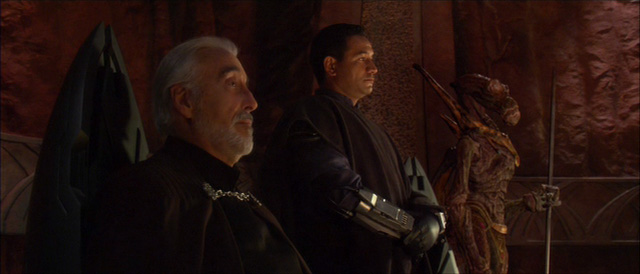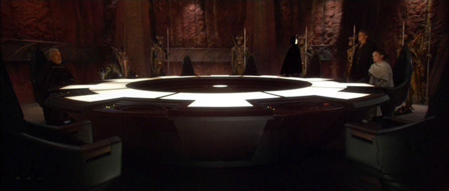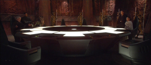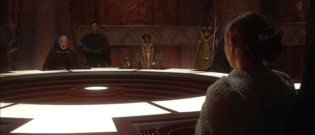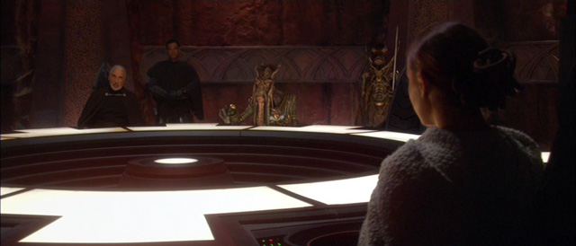 COUNT DOOKU sits at a large conference table with PADMÉ on the