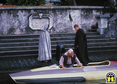 ANAKIN and PADMÉ step onto the landing platform from the water