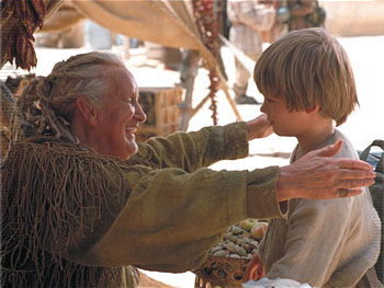 SHMI hugs ANAKIN. QUI-GON watches from the distance. She kneels