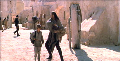 ANAKIN and QUI-GON exit WATTO'S and stop before JIRA'S fruit