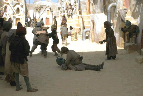 - EXT. MOS ESPA - STREET - SLAVE QUARTERS - DAY
