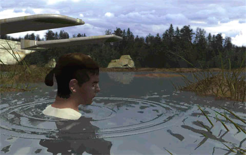 OBI-WAN's head emerges from the mud of a shallow lake. Far in