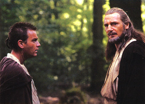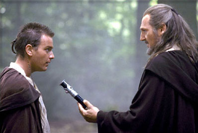 OBI-WAN pulls out his burnt laser sword handle. QUI-GON inspects