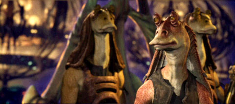 JEDI like a charging locomotive. JAR JAR stands transfixed, still