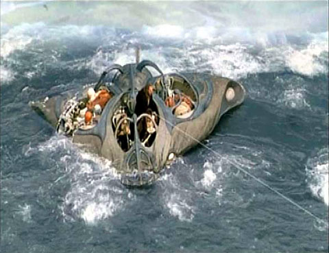 is a LOUD RUSH OF BUBBLES, and a small sub bobs to the surface.