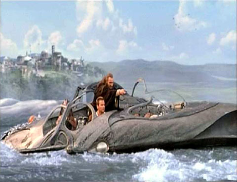 of them. JAR JAR climbs up on shore between the JEDI.
