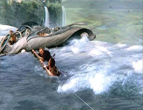 sub breaks lose, crashing down the waterfall.