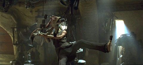 CREATURES start to gather. SEBULBA shoves JAR JAR to the ground.