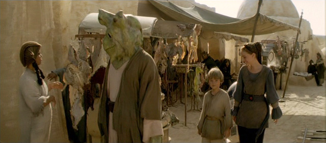 ANAKIN and the GROUP stop at a fruit stand run by a jolly, but very