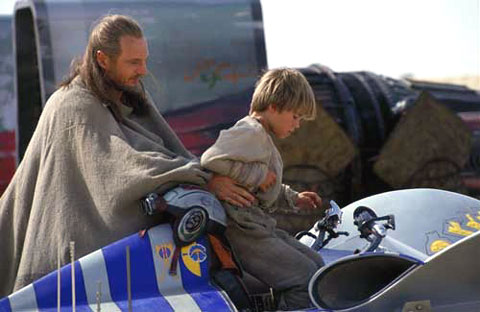 PADMÉ moves away as SEBULBA edges his way next to ANAKIN and